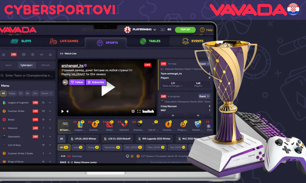 Odjeljak sportske kladionice za e-sportove omogućuje vam klađenje na natjecanja League of Legends, Counter-Strike: 2 i VALORANT, između mnogih drugih. Utakmice uživo održavaju se svaki dan i možete jednostavno gledati prijenose uživo dok se također kladite s visokim koeficijentima. Natjecanja na koja se najviše kladi su: