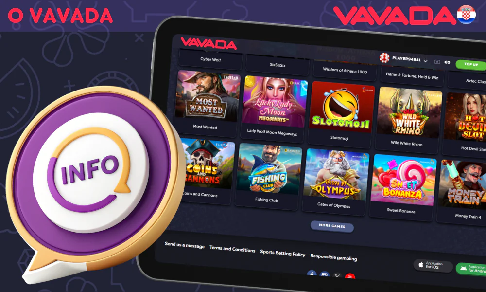 Vavada Casino i sportska kladionica pokrenuta je 2017. Stranica, koja ima Curaçao licencu pod brojem OGL/2024/252/0153, u vlasništvu je i kojom upravlja Vavada BV, vrlo renomirani operater kockanja. Tvrtka službeno posluje u Hrvatskoj i više od 20 zemalja, ima dobar rejting na AskGamblers.com i promovira odgovorno kockanje.