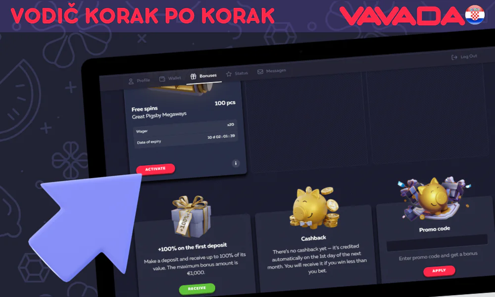 Nakon što imate svoj račun na Vavada, idite na karticu “Bonusi” na svom profilu i aktivirajte 100 besplatnih okretaja. Kliknite na “Igraj” da otvorite utor u kojem možete iskoristiti svoj dar. Ne morate raditi sve okrete u istoj sesiji.
